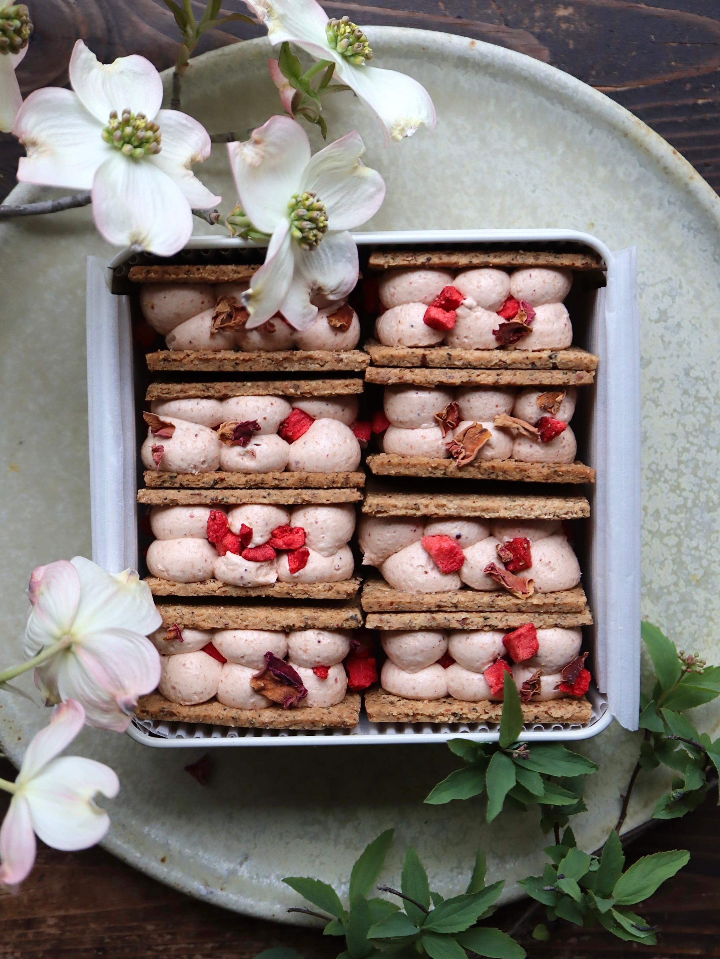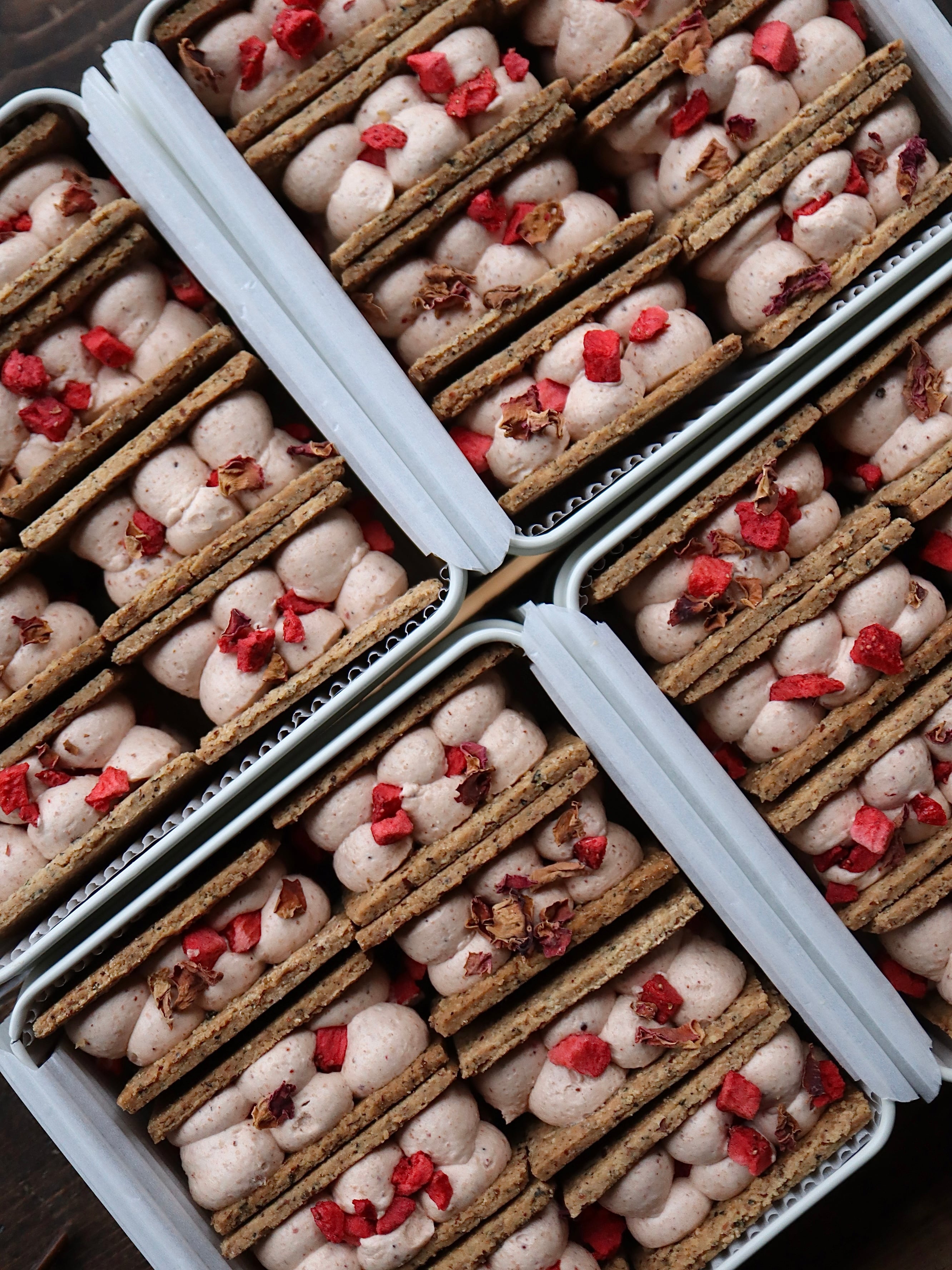アールグレイがほんのり香るグルテンフリーのサブレにハイビスカスでピンク色に色付けしたクリーム、フリーズドライのいちごをサンド。